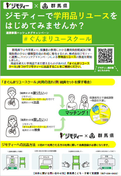 今年度より本県では、「保護者の教育にかかる費用負担軽減及び環境負荷の少ない循環型社会の形成への寄与」を目的に、株式会社ジモティーと連携し、ハッシュタグキャンペーンによる学用品リユースを推進することになりました。上記リーフレット、また詳細については群馬県ホームページをご確認されご活用ください。