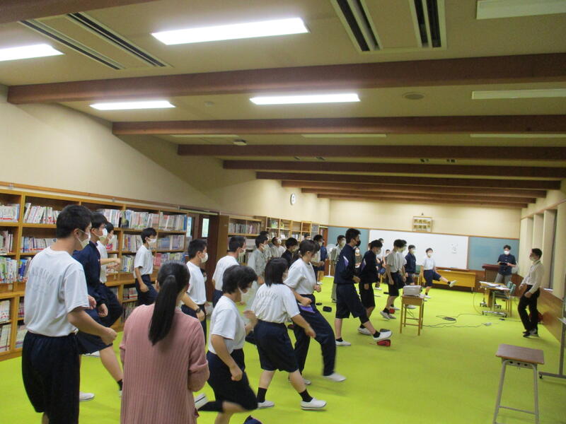 マーク先生の自己紹介の後は、身体をたくさん使い、英語を学ぶ活動をしました。”Head(ヘッド) shoulders(ショルダーズ) knees(ニーズ) and(アンド) toes(トウズ)”から始まり、身体部位の英語を自らその部位に触れ、身体を動かしながら体感を通し英語学習をします。次は“Simon(サイモン) says(セッズ)”をし、さらに身体を動かす英語-walk(ウオーク) kick(キック) spin(スピン) jump(ジャンプ) swing(スイング) touch(タッチ)等々に触れ、繰り返し身体を動かしながら英語学習を続けます。本時の学習のまとめとし、繰り返し学習した英語を活用し、生徒たちからも大人気な韓国のヒップホップグループBTS(ビーティーエス)“Dynamite(ダイナマイト)”の曲に合わせ、身体を動かします。マーク先生の英語を聞き、マーク先生の動きに合わせ身体を動かすことにより、ダンスをするようにできる活動です。最初は動きが難しく動けない生徒がいました。しかし繰り返し動きの確認練習を重ねることにより、身体の感覚が入っていくのでしょう。少しずつスムーズに動くことができるようになっていきました。ダンスは視る力を育てると言われます。しっかりと見て、様々な身体の動きを真似して動くことにより、感覚は入っていくことを生徒の動きを観察し改めて感じました。