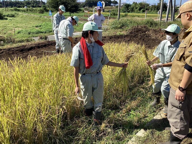農業園芸科で稲の収穫を行いました。1年生が初めての稲刈りに挑戦しました。