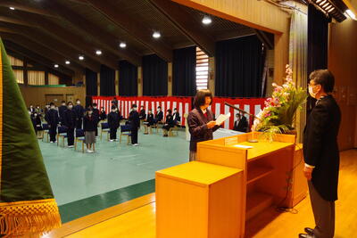 新入生代表が大きな声で宣誓をし、入学生25名(普通科5名 農業園芸科3名 産業工芸科10名 家政被服科 7名)の入学が学校長より許可され、在校生112名による令和2年度がスタートしました。