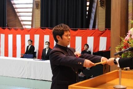 3月1日、第25回卒業証書授与式が行われ、32名の生徒が巣立っていきました。今年度は、新型コロナウイルス感染症対策による制限が無くなり、マスクをせず晴れやかな表情で新たな一歩を踏み出しました。校長先生から、ひとりひとり卒業証書を授与していただき、答辞では代表の生徒が、お世話になった方々への感謝の気持ちやこれからの決意を堂々とした態度で述べることができました。また、式後には、中庭で卒業生によるサプライズのエールを行い、保護者に感謝の思いを綴った手紙を渡しました。この3年間で大きく成長した生徒達、社会人になっても頑張ってほしいと思います。