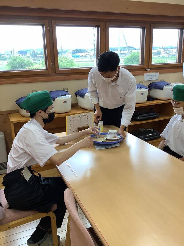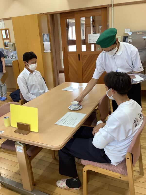 次に、前西生がウエイターに挑戦です!本校の生徒は、お客様の立場になって練習をします。お客様の立場になり、ウエイター業を考える体験をするためです。