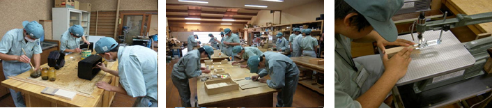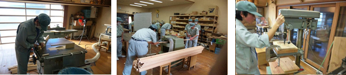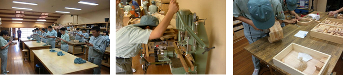 木工作業 産業工芸科では、1年生から3年生まで木工作業に取り組んでいます。 こちらの写真は左から、作業の心得唱和、角のみ盤作業、鉢カバー組み立ての様子です。 こちらの写真は左から、丸鋸盤作業、カンナ盤作業、ボール盤作業の様子です。 こちらの写真は左から、塗装作業、木工室全体、糸のこ盤作業の様子です。 こうして出来上がった木工製品です。 下記リンクよりご覧ください。 手工芸 環境美化 総合実習 農業園芸 木工 陶芸 被服 クリーニング